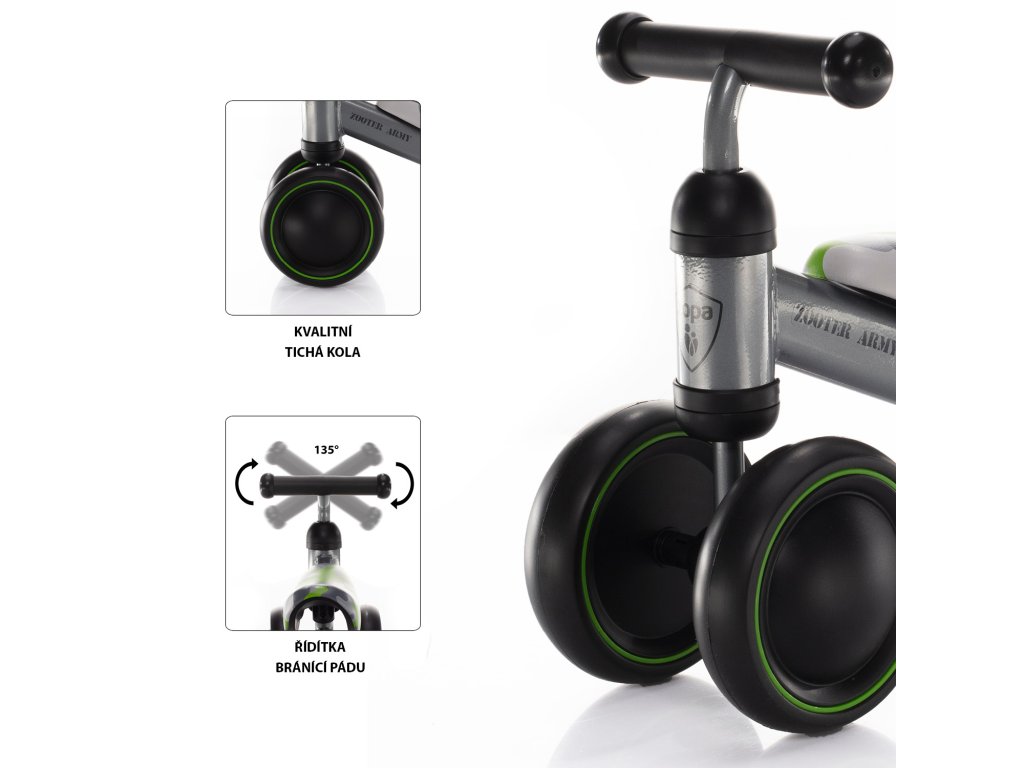 Zooter – stylové odrážedlo pro malé jezdce Zooter je kvalitní odrážedlo navržené pro děti, které chtějí objevovat svět v pohybu. Díky pevné kovové konstrukci je odrážedlo stabilní a odolné i při každodenním používání. O maximální pohodlí dítěte se postará měkké polstrované sedátko, které zajišťuje komfort i při delších projížďkách. Speciální technologie koleček „silent wheels“ umožňuje tichou a plynulou jízdu, takže je Zooter ideální jak do interiéru, tak ven. Moderní a atraktivní design potěší děti i rodiče, zatímco snadná údržba usnadní péči o odrážedlo. Odrážedlo je vhodné pro děti od 18 měsíců do 20 kg a podporuje rozvoj rovnováhy i pohybových dovedností. Hlavní vlastnosti: Pevná kovová konstrukce Měkčené polstrované sedátko Technologie koleček „silent wheels“ pro tichou jízdu Atraktivní design Vhodné pro děti od 18 měsíců do 20 kg Snadná údržbaDoplňkové parametry