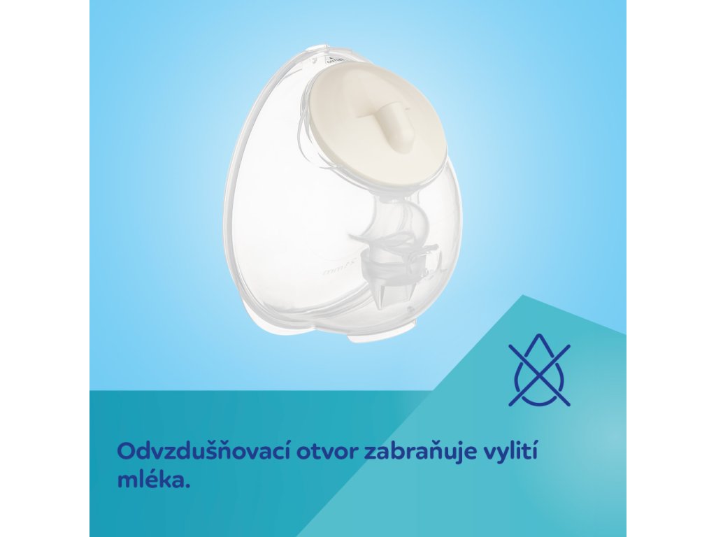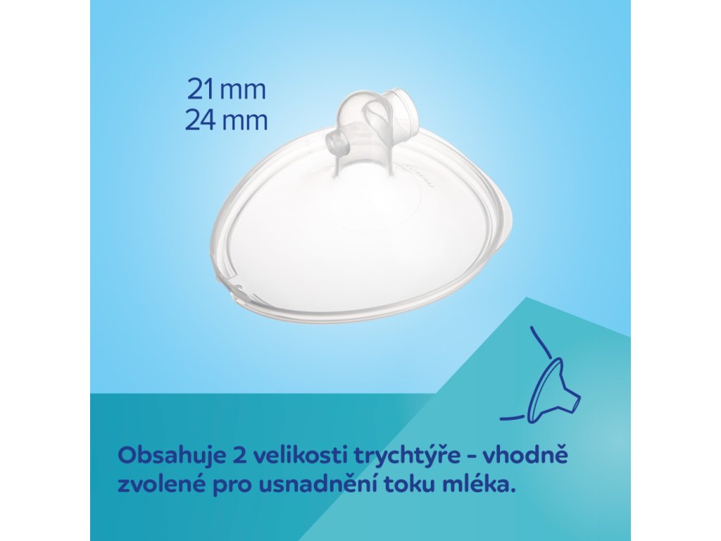 V sadě dvě velikosti trychtýře: 21 mm a 24 mm – správně zvolená velikost umožňuje bezbolestné odsávání mateřského mléka.