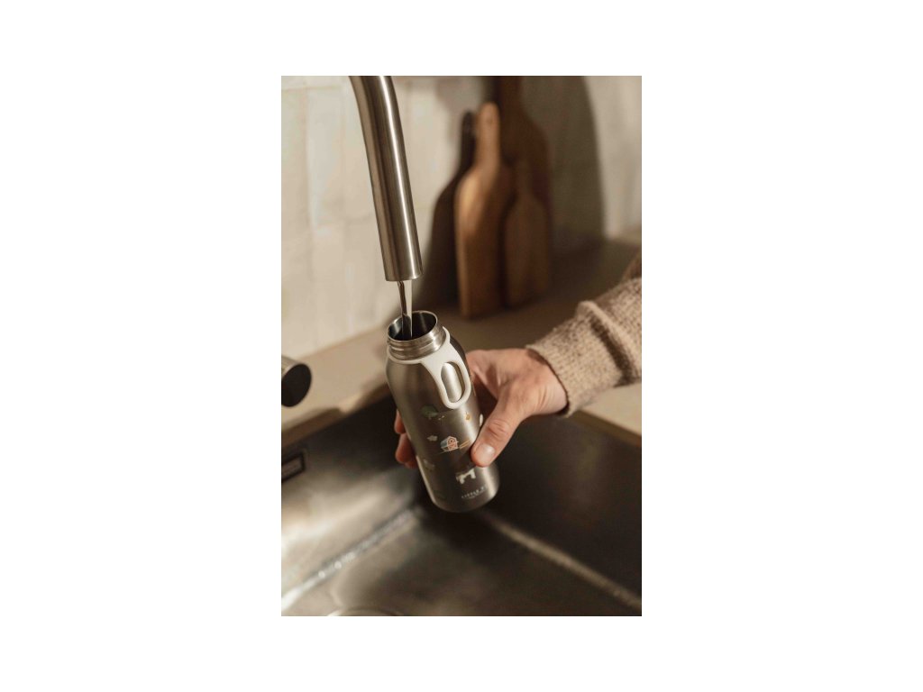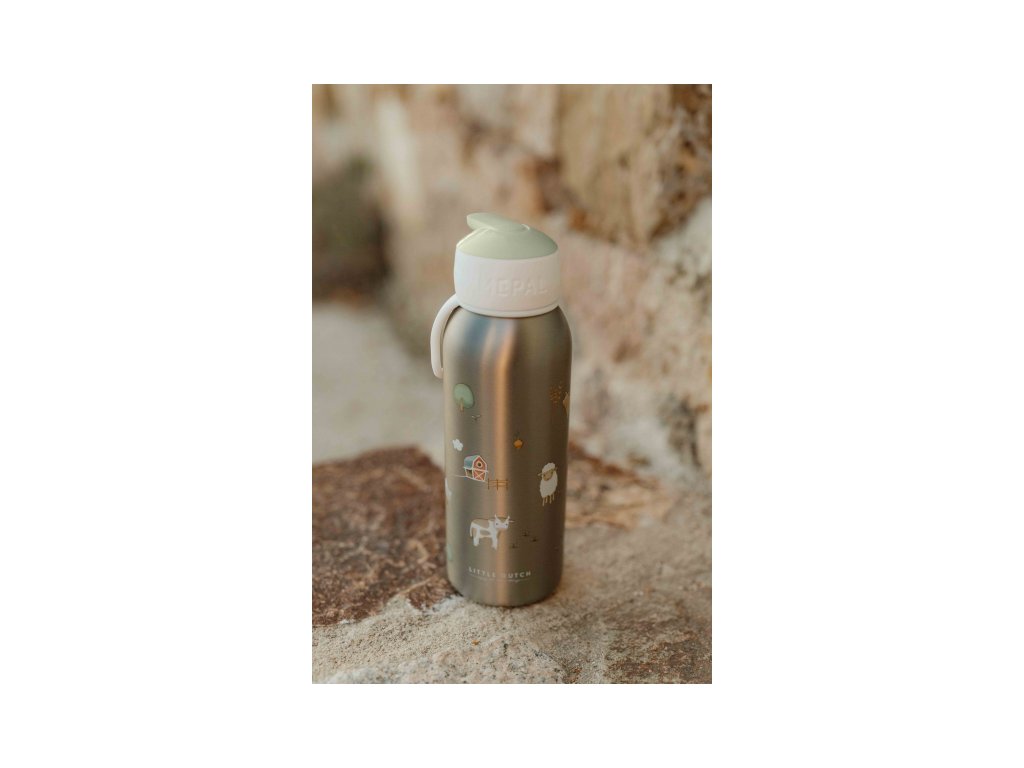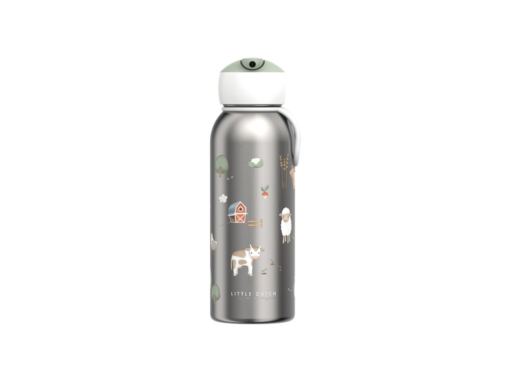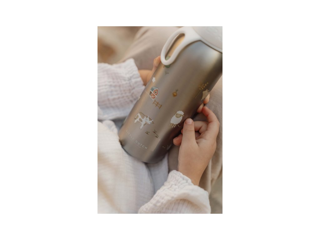 Termoláhev Little Dutch je vyrobena z vysoce kvalitní dvoustěnné oceli a udrží nápoj déle teplý (až 4 hodiny) nebo studený (až 12 hodin). Je tak vhodná pro zahřátí teplým nápojem během procházek v zimě a naopak pro osvěžení chladným nápojem během horkých letních dní. Zaklapávací pítko s odnímatelným brčkem umožňuje snadné pití bez nutnosti naklánění láhve. Bez brčka je možné láhev používat i pro sycené nápoje. Odnímatelné poutko usnadňuje přenášení. Zaklapnutím pítka je chráněn obsah láhve před vylitím. Termoláhev je součástí designové kolekce Little Dutch Farma, ve které najdete jídelní doplňky pro dětské stolování, ložní prádlo, dekorativní doplňky do dětského pokoje i dřevěné a plyšové hračky. Jednotlivé součásti láhve lze rozebrat pro snadné mytí. Plastové části je možné mýt v myčce, nerezové tělo láhve je pro udržení dlouhé životnosti doporučeno mýt ručně. Objem: 350 ml Rozměry: 20,2 x 6,5 x 7 cm Hmotnost: 310 g Složení: nerezová ocel, PP Neobsahuje BPA.Doplňkové parametry