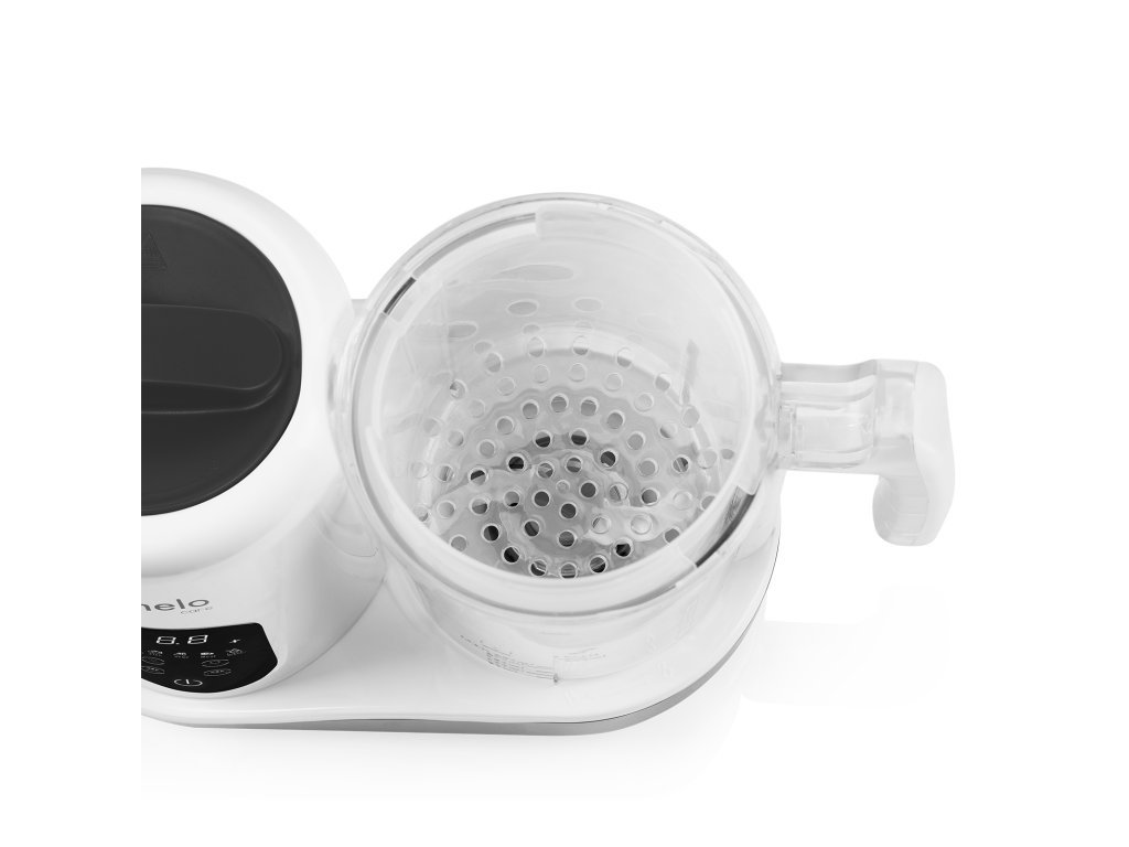 Zařízení má integrovaný ohřívač, který vám umožní nejen rychle ohřát, ale také rozmrazit mléko nebo zavařovací sklenici. Funkce vaření v páře a mixování však výrazně usnadňuje vytváření výživných jídel od začátku. Stačí nalít vodu do nádržky, vložit jídlo do vyhrazeného koše a poté jedním tlačítkem zapnout funkci vaření v páře. Hotové ingredience by měly být vytaženy pomocí naběračky, která je součástí sady, a smíchány pomocí nožů na dně. Kalich vyrobený z Tritanu je nejen bezpečný, ale také odolný. Možnost ručního i automatického nastavení doby mixování, vaření v páře nebo ohřevu vám však umožňuje přizpůsobit konfiguraci robota vašim potřebám. Díky kombinaci až 5 funkcí mohou rodiče rychle a snadno sestavit pro své dítě výživné jídlo - velikost a konzistenci porcí přizpůsobí aktuálním požadavkům.