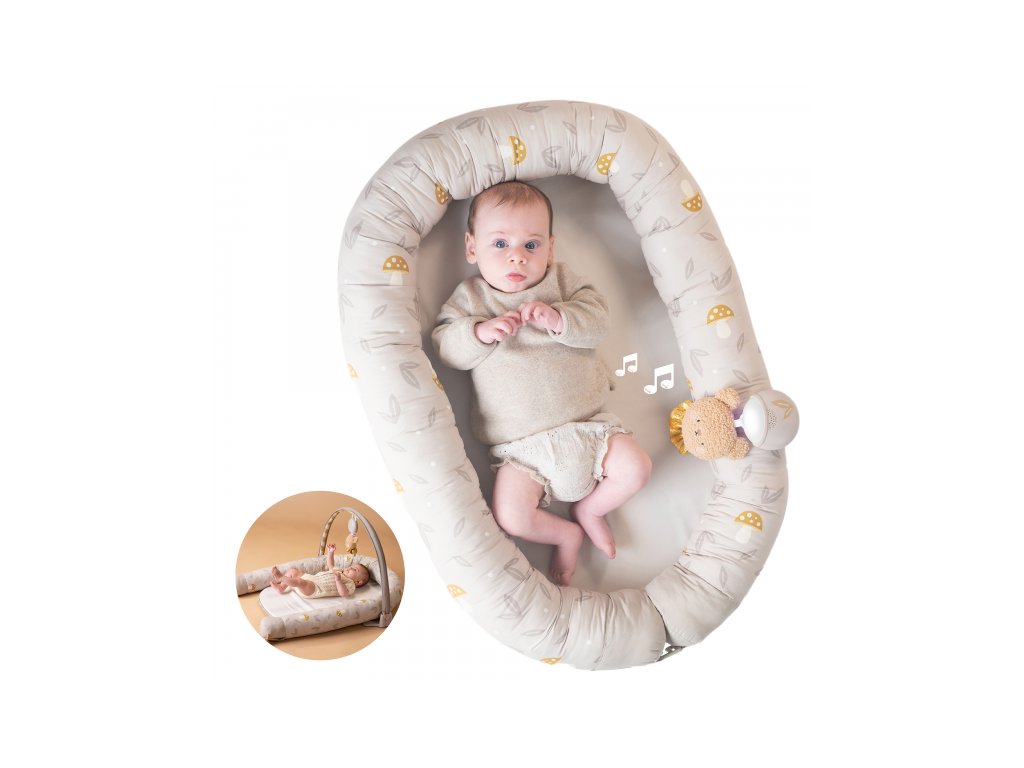 Hnízdo pro miminko Taf Toys je praktický doplněk, který roste spolu s dítětem. V prvních týdnech slouží jako měkké, bezpečně obepínající hnízdo, ve kterém se novorozenec lépe zklidní a odpočívá. Od třech měsíců věku dítěte lze hnízdo rozložit a využít jako pohodlný prostor pro hraní. Součástí odnímatelné hrazdy je plyšový medvídek se světýlky a 22 minutami uklidňujících melodií, které pomáhají miminko zabavit i uklidnit. Hudební medvidek je použitelný i samostatně. Rozměry hnízda: 80 × 30 cm Baterie 2xAAA nejsou součástí balení. Údržba: textilní části možno prát v ruce, hudebního medvidka pouze otírejte, neponořujte do vody Vhodné pro děti od narození.Doplňkové parametry