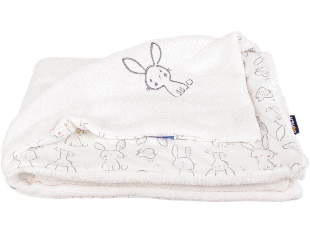 Dětská oboustranná deka z dvou vrstev materiálu Wellsoftu a bavlny. Vrchní strana je ze smetanového Wellsoftu (100% polyester) s výšivkou zajíčka a spodní strana je ze 100% bavlny s potiskem zajíčků. Rozměr deky je 70 x 100 cm. Praní na 30 °C. Vyrobeno v ČR.Doplňkové parametry