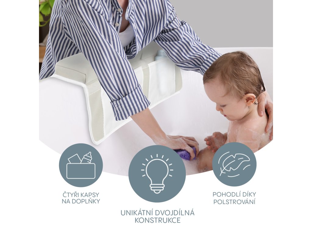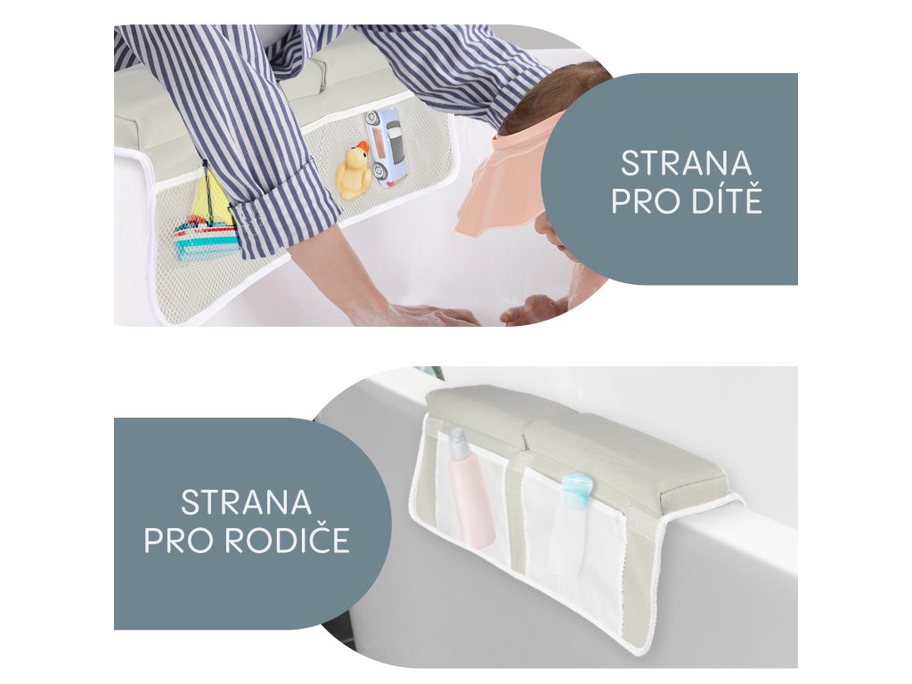 Maximální pohodlí a praktičnost při koupání Zpříjemněte si čas strávený u vany s loketní podložkou na okraj vany, která poskytuje dokonalé pohodlí při koupání dětí. Její dvoudílná konstrukce umožňuje nastavit loketní opěrku přesně podle potřeb, bez ohledu na velikost vany. Podložka je vybavena šesti silnými přísavkami, které zajišťují, že zůstane bezpečně na místě. Boční panely se snadno přizpůsobí i vanám s kolejnicemi sprchových dveří. Čtyři praktické kapsy navíc poskytují prostor pro uložení mýdel, šamponů či dalších koupelnových doplňků, aby bylo vše potřebné vždy po ruce. • Dostatečně silné polstrování poskytuje dokonalé pohodlí a měkkost• 6 pevných přísavek pro bezpečné upevnění bez posouvání• Boční panely vhodné pro vany s kolejnicemi sprchových dveří• Dvoudílná konstrukce umožňuje použití pro každý typ vany• 4 kapsy pro praktické uložení doplňků a mýdel• Snadná údržba a rychlé uschnutí po použitíDoplňkové parametry