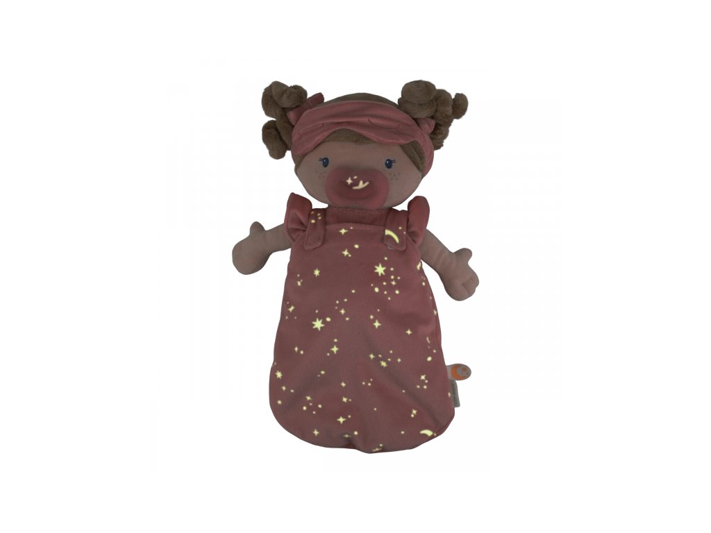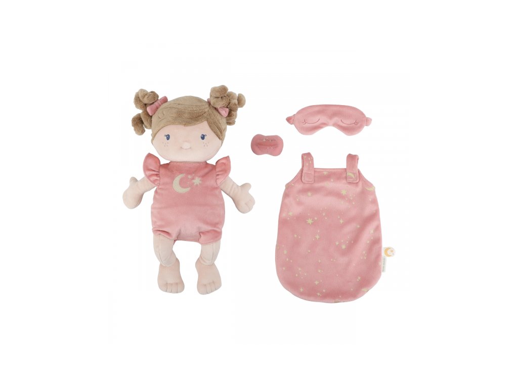 Něžná plyšová panenka Rosa z měkkého jemného materiálu je připravena na spaní, oblečena do pyžámka, vybavená plínkou, spacím pytlem, šidítkem i clonou na oči. Je vhodná na hraní i mazlení a bude se s ní i krásně usínat! Výplň je vyrobena ze 100% recyklovaného polyesteru s certifikací GRS (Global Recycled Standard). Rozměry: 37 x 22 x 10 cm Složení: 100% polyester Možno prát v ruce. Vhodné pro děti od 12 měsíců.Doplňkové parametry