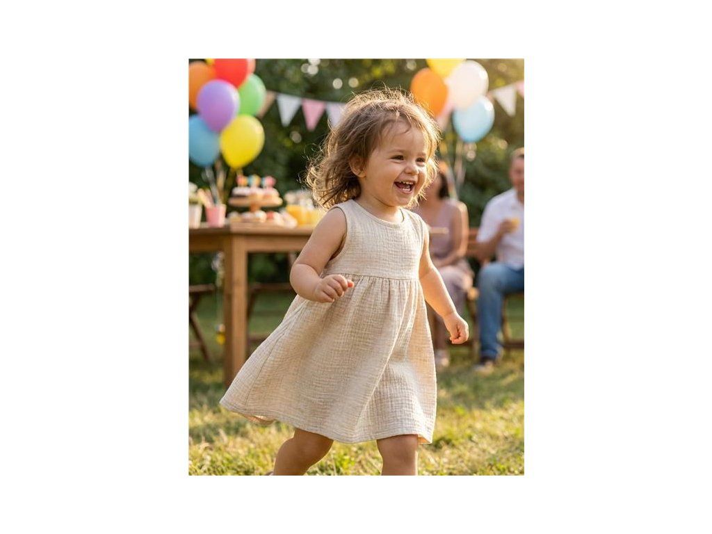 Módní mušelínové kojenecké šatičky české značky New Baby pro všechny malé parádnice. Šatičky jsou bez rukávů ve tvaru písmene A. Spodní část má krásně nařasenou sukýnku. Zapínání na cvoček na zadní straně usnadní oblékání. Šaty mají velmi příjemňoučký, měkoučký a kvalitní materiál, který je vhodný pro miminka. Jsou lehounké a velmi příjemné při nošení. Pro New Baby je velmi důležitá spokojenost zákaznika a právě proto vám nabízíme naši kvalitní letní mušelínové šatičky. Složení: 100% bavlna. OEKO-TEX STANDARD 100. Mušelín je jedna z nejčistších, nejjednodušších a nejjemnějších tkanin na světě. Jemně tkaný prodyšný materiál je tak dokonalý, že si jej zamilují děti po celém světě. Lehká struktura umožňuje mušelínu „dýchat“ a zajišťuje dostatečnou cirkulaci vzduchu, čímž snižuje riziko přehřátí. Tato vlastnost pomáhá udržet Vaše dítě v pohodlí, bezpečí a rodiče v klidu. Mušelín je velmi odolný a to tak, že bez problémů zvládá opakované praní a postupem času je lehčí a jemnější.Doplňkové parametry