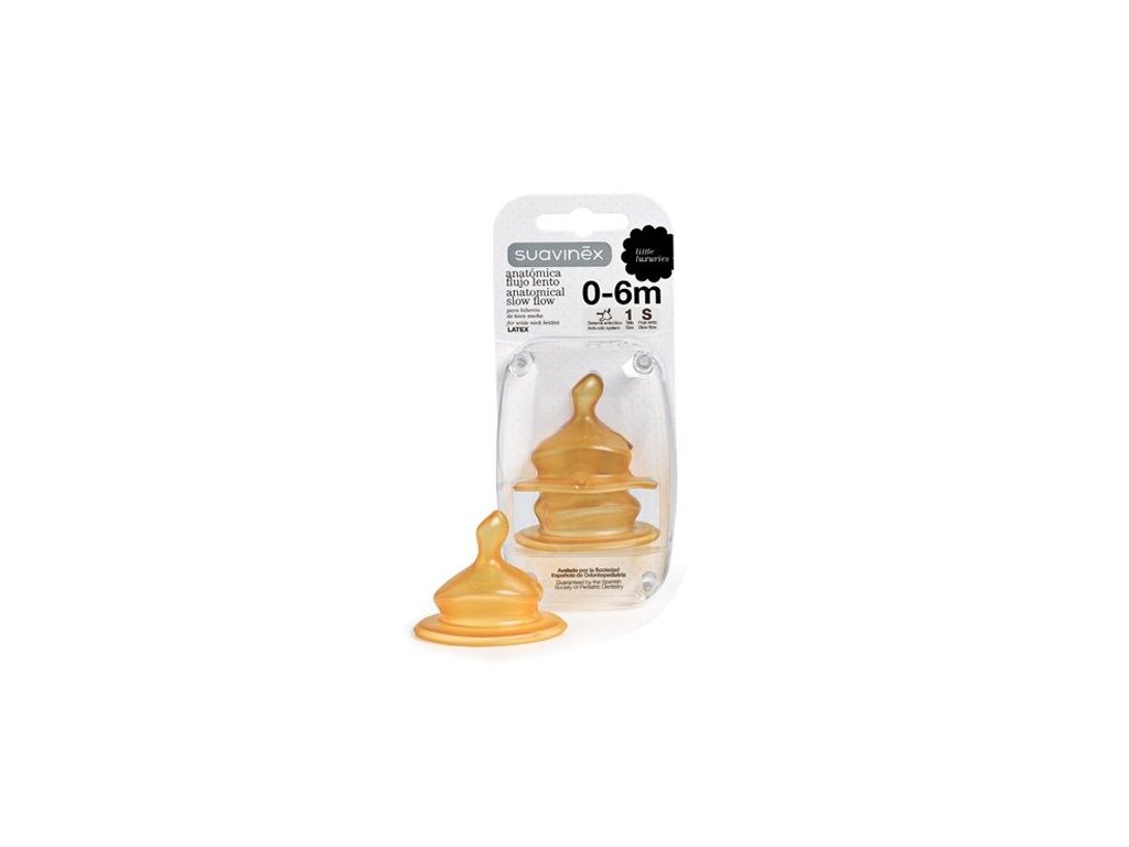 Savičky Suavinex se přizpůsobují potřebám miminka ve všech etapách jeho růstu. Nabídněte si z možností vybrat si velikost savičky dle věku dítěte (S1 - mladší děti, S2 - starší děti a UNIverzální velikost - pouze orientační označení, každé dítě má jiný sací reflex) a tvar - anatomickou nebo kulatou savičku. U výrobků Suavinex máte rovněž možnost volby materiálu saviček - latexové/silikonové a možnost výběru velikosti průtoku savičky - S, M a L (od nejmenšího po největší). Podle dětských zubařů jsou kvalita a design saviček dokonalé pro správný vývoj patra. Savičky jsou vyrobené z materiálů, které napodobují jak svou konzistencí, tak pohybem mateřský prs během sání při kojení. Díky ventilkům umístěným na její horní hraně napomáhají předcházet škytavce a kolikám. Vyberte si savičku pro své děťátko ze široké nabídky saviček značky Suavinex - najdete pro něj určitě tu, díky které mu bude chutnat. Pro ty, co se rozhodnou pro dokrmování nebo výhradně pro umělou výživu, je výběr savičky na kojenecké láhve velmi důležitý. Širokohrdlé savičky Suavinex jsou kompatibilní se všemi širokohrdlými láhvemi značky Suavinex. Balení: 2 ks Velikost průtoku savičky: S (pomalý průtok) Materiál: latex (přírodní materiál, který je teplejší, pružnější a barvou napodobuje mateřskou bradavku) Doporučený věk: 0-6 měsíců Vyrobeno v rámci EU. Veškeré výrobky jsou bez BPA, klinicky testované a vyrobené španělským farmaceutickým výrobcem.Doplňkové parametry