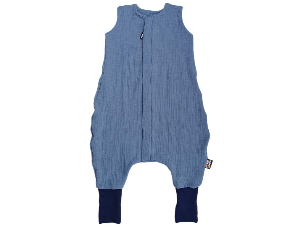 Letní spací pytel s nohavicemi z modrého mušelínu. Spací pytel má uprostřed zip a lze jej zcela otevřít v obou směrech, zip má látkovou krytku, která zabraňuje přiskřípnutí krku do zipu. Délka spacího pytle je cca 90 cm, to odpovídá velikosti oblečení 110 až 116. Náplety na nohou nejsou zahrnuty v délce, překlopením se uzavřou a slouží jako ponožky. Spací vak má TOG 0.83 je tedy vhodný do teploty 21 až 25 °C. Teplota lze regulovat oblečením - krátký nebo dlouhý rukáv, pyžamko, bodýčko apod. Lze jej prát v pračce při 30 °C. Spací pytel je ušitý ze 100% bavlny v úpravě mušelín (plenkovina, fáčovina). Česká výroba.Doplňkové parametry