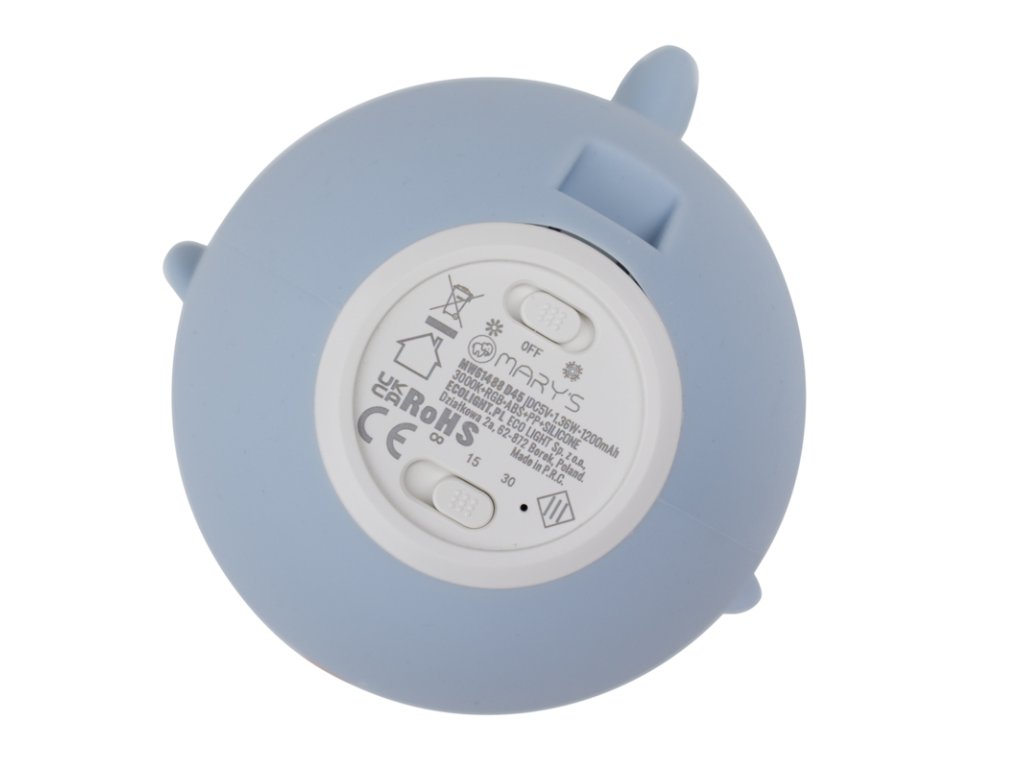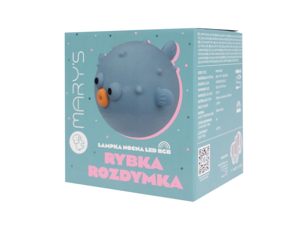 Mary's LED lampička dotyková RGB - Puffer Fish, modráVeselá lampička ve tvaru oblíbené nafouknuté rybičky fugu od značky MARY'S vnáší do dětského pokojíčku klidnou mořskou atmosféru a její jemné světlo pomůže navodit uklidňující atmosféru před spaním. Její jemný, teplý odstín je ideální pro čtení pohádek a noční vstávání. Jediným pohybem můžete lampu přepnout do barevného režimu a dodat tak svému pokoji nádech pohádkové magie.Vestavěná baterie zajišťuje mnoho hodin bezdrátového provozu a po večerním rituálu ji můžete pohodlně dobít přes USB-C kabel. Lehké a na dotek příjemné tělo lampičky v sobě kombinuje pružný silikon s hladkými materiály, díky čemuž je lampa bezpečná pro dětské ruce a odolná při každodenním používání. Kompaktní velikost se snadno vejde na noční stolek nebo psací stůl. Součástí balení je kabel USB-C, díky němuž může být lampička snadno a rychle připravena k opětovnému použití. Energeticky úsporná a uklidňující rybička se stane vaším oblíbeným modrým společníkem před spaním.Vlastnosti a výhody:Funkce automatického vypnutí: po aktivaci časovače se lampička automaticky vypne po 15 / nebo po 30 minutách.Nastavení intenzity jasu: jemným poklepáním na lampičku změníte intenzitu svíceníSvětlo:Barva / jas: nastavitelnéChromatičnost: Teplá bílá 3000 K + RGB (variabilní barvy)Zdroj světla:Zdroj světla: integrovaný LED (nevyměnitelný)Patice (objímka): zdroj světla je integrovanýOvládání: dotykové / tlačítkovéSvětelné efekty a senzory: Nastavení barvy světla (RGB)Typ: LED noční lampičkaVhodné využití: dětský pokoj, obývací pokoj, v domácnostiDoplňkové parametry