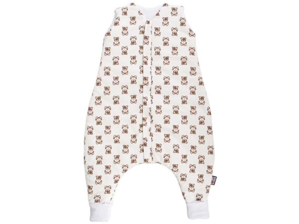 Dětský spací pytel s otvory pro nohy ve smetanové barvě s potiskem medvídků, miminko v něm může volně kopat nožičkami. Délka spacího pytle je cca 110 cm, to je výška dítěte k ramenům. Lze jej prát v pračce při 30 °C. Spací pytel má uprostřed zip a lze jej zcela otevřít v obou směrech, navíc má zip látkovou krytku, která zabraňuje přiskřípnutí krku do zipu. Náplety na nožičkách lze překlopit a otvory uzavřít, takže nožičky zůstanou v teple. Spací pytel je ušitý ze tří vrstev: vrchní materiál 100% bavlna, výplň 100% polyester, podšívka 100% bavlna. Tog 2,61. Česká výroba.Doplňkové parametry