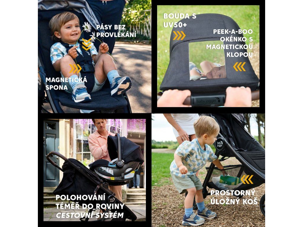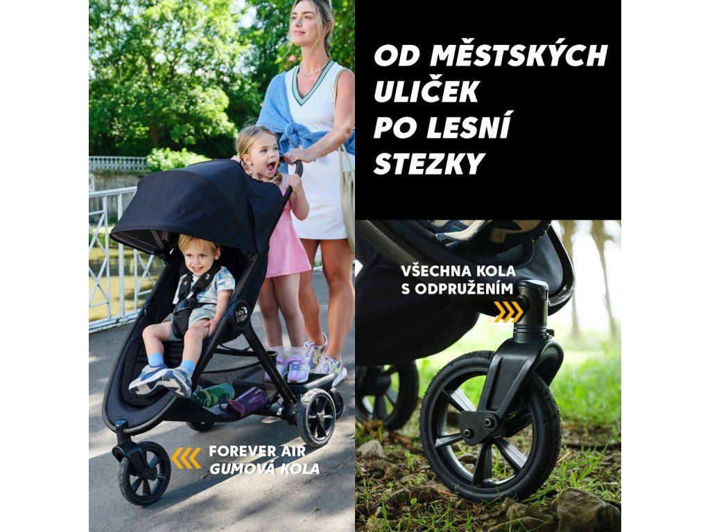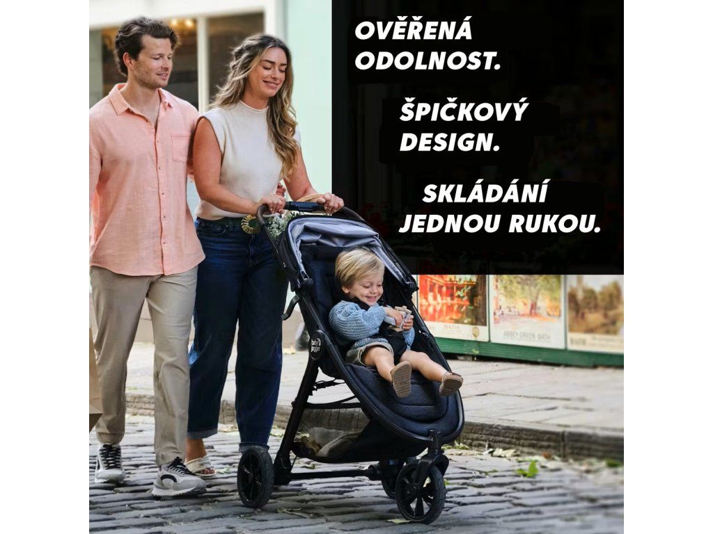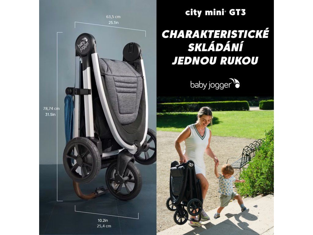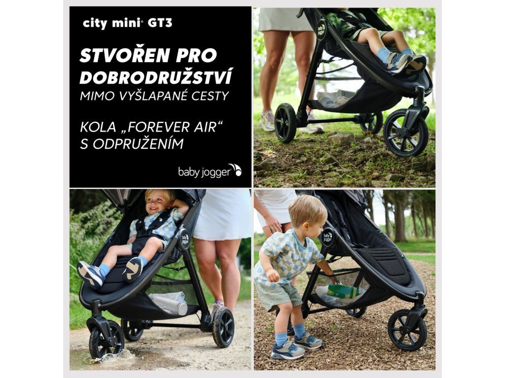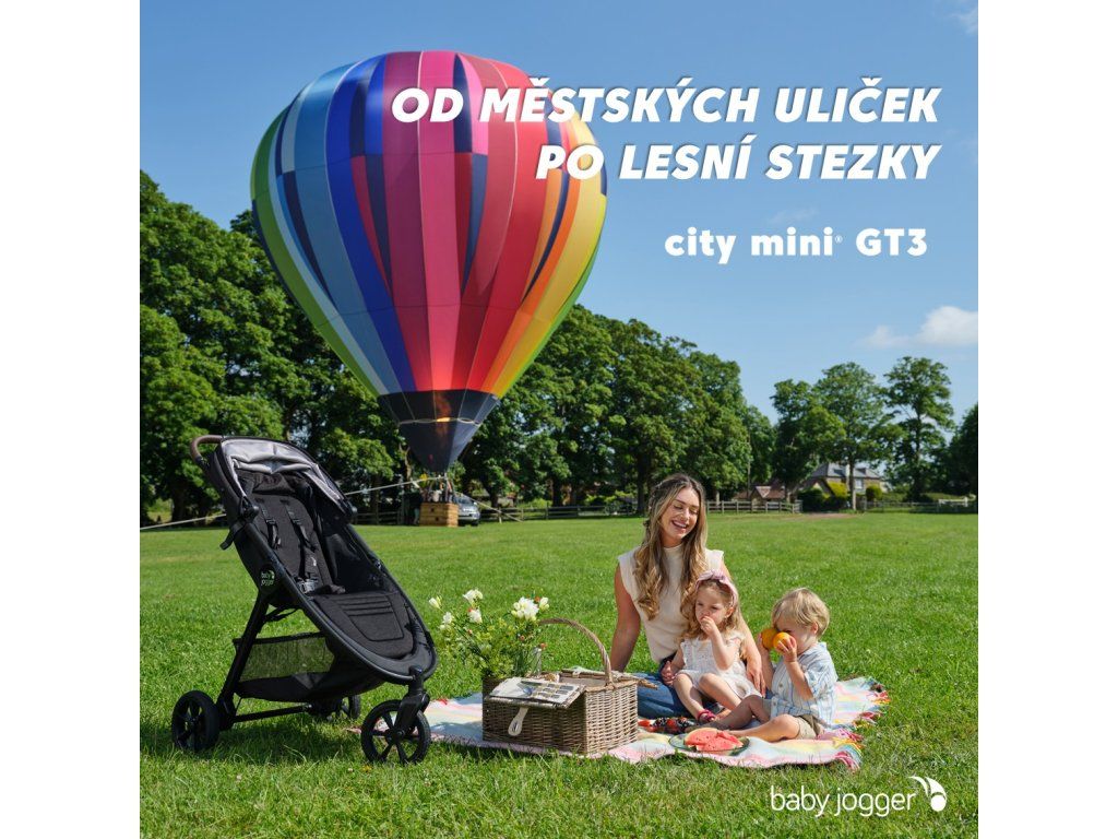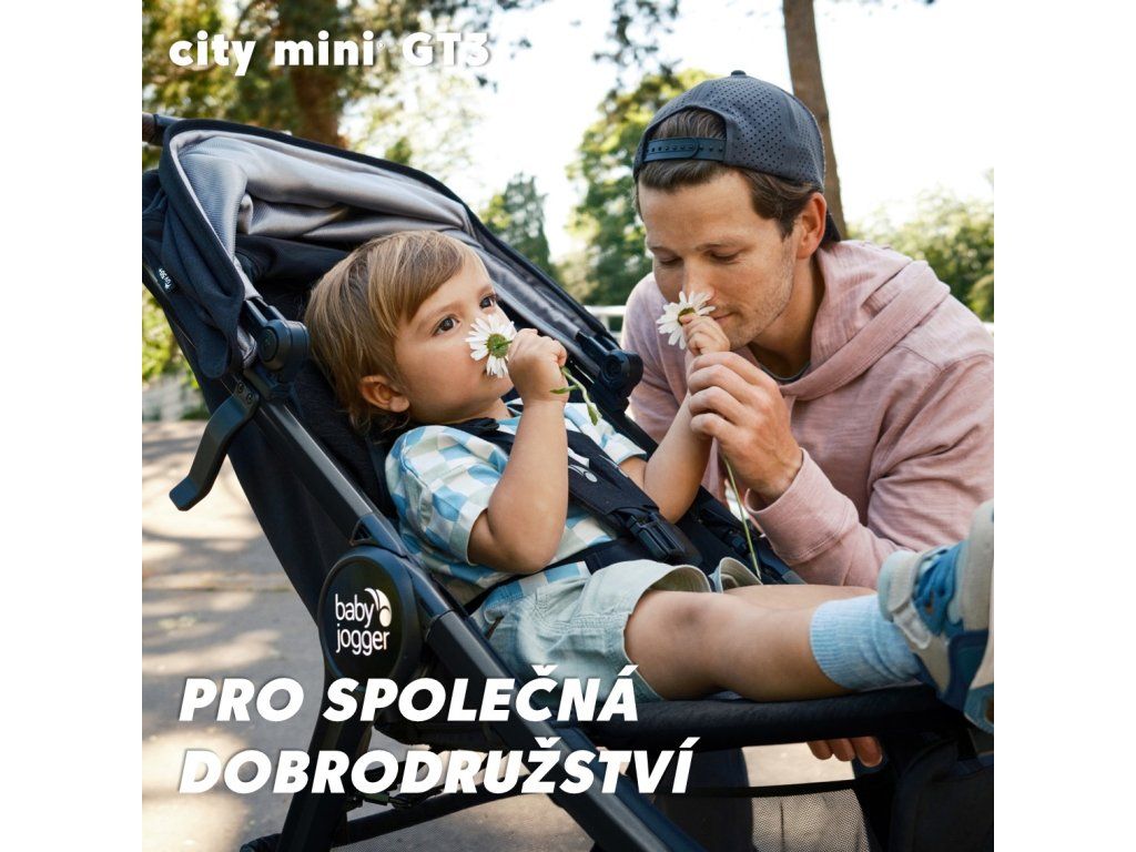 city mini® GT3stvořen k dobývání městských ulic i lesních stezekKočárek byl navržen pro rodiny, které se pohybují jak po městských ulicích, tak po nerovných cestách. city mini® GT3 nabízí každodenní pohodlí a prvotřídní design, který se snadno začlení do každodenního života.TOP VLASTNOSTI:• Ověřená odolnost. Prémiový design. Skládání jednou rukou. • Gumové pneumatiky „Forever Air“ s odpružením všech kol zajišťují bezkonkurenční ovladatelnost v jakémkoli terénu, takže můžete snadno přejít z městských ulic na lesní stezky.• Charakteristické skládání jednou rukou s automatickým zajištěním, díky kterému je kočárek samostatně stojící. • Výškově nastavitelná rukojeť s koženkovým potahem poskytuje prvotřídní zážitek z jízdy.• Bezpečnostní pás bez nutnosti provlékání s magnetickou sponou usnadňuje nastupování a vystupování.Ověřená odolnost. Špičkový design. Skládání jednou rukou. Kočárek Baby Jogger® city mini® GT3 je stvořený pro dobrodružství mimo vyšlapané cesty. Je navržen tak, aby si poradil s městskými ulicemi i lesními stezkami. Díky pneumatikám Forever Air a odpružení všech kol můžete při svých dobrodružstvích posouvat hranice.Díky charakteristickému skládání jednou rukou můžete být neustále v pohybu a vydat se se svým dítětem na společná dobrodružství. Samostatně stojící konstrukce kočárku usnadňuje skladování a pomáhá udržet kočárek na veřejných místech čistý, protože ho nemusíte pokládat na zem. Vychutnejte si prvotřídní zážitek z jízdy díky výškově nastavitelné rukojeti potažené koženkou, magnetické centrální sponě a prostornému úložnému košíku.Bezpečnostní pásy se snadno přizpůsobí růstu vašeho dítěte, stačí jednoduše zatáhnout a umístit do odpovídající výšky. Díky polohovací opěrce nožiček a sklopnému sedátku téměř do roviny může vaše dítě bezpečně a pohodlně odpočívat.Pokud se chce vaše dítě opět posadit, stačí opěradlo kočárku posunout do vzpřímené polohy – bez zbytečných popruhů a složitých úkonů. Praktická stříška je vybavena třemi větracími otvory s magnetickým zapínáním, takže dítě nemusíte budit hlasitým rozepínáním zipu, když jej chcete zkontrolovat.Přiložené adaptéry na autosedačku jsou kompatibilní se všemi autosedačkami značek Baby Jogger a Graco®, takže si můžete sestavit vlastní cestovní systém. Jelikož je tento kočárek součástí kolekce Baby Jogger eco, je vyroben z měkkých látek z recyklovaných materiálů.Doplňkové parametry
