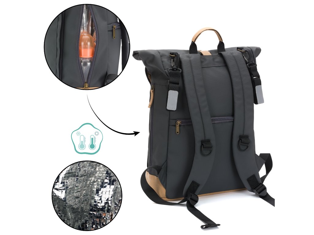 Přebalovací batoh Berlin v moderním rolltop provedení je stylovým a zároveň maximálně praktickým společníkem nejen pro přebalovací období. Nabízí všechny důležité funkce přebalovacího batohu, ale zároveň působí jako moderní, městský batoh, který budete rádi používat i dlouho poté. Kombinace pravé semišové kůže a odolného techno materiálu z polyuretanu dodává batohu luxusní vzhled, vysokou kvalitu a zároveň odolnost pro každodenní použití i dobrodružství v přírodě. Batoh Berlin není jen designový, ale také velmi praktický. Rolltop uzávěr umožňuje plynule zvětšit objem batohu z 20 až na 25 litrů při plném otevření. Magnetické zapínání umožňuje rychlé a snadné otevření kožené přezky. Další praktický vstup se nachází na zadní straně batohu a umožňuje rychlý přístup k věcem uloženým na dně. Na přední straně se nachází samostatná kapsa na přebalovací podložku, která je součástí balení. Na zadní straně je menší bezpečnostní kapsa na peněženku, klíče nebo jiné cennosti, chráněná proti krádeži. Po stranách batohu jsou dvě kapsy na lahve až do objemu 0,5 l. Jedna z nich je navíc vybavena termoizolační vrstvou, která udrží kojeneckou lahev déle teplou, případně později nápoj pro maminku či tatínka chladný. Díky ergonomicky tvarovaným a měkce polstrovaným ramenním popruhům je batoh pohodlný i při delším nošení. Součástí balení jsou také dva úchyty pro snadné připevnění ke kočárku nebo golfkám. Tyto úchyty jsou opatřeny reflexními prvky, které zvyšují bezpečnost při zhoršené viditelnosti. Vlastnosti produktu rolltop batoh s magnetickým zapínáním nastavitelný objem: 20–25 l detaily z pravé kůže úchyty ke kočárku s reflexními prvky přebalovací podložka součástí balení termo kapsa na lahve více úložných přihrádek ergonomicky tvarované a polstrované ramenní popruhy Technické údaje rozměry při plném otevření (d × š × v): 28 × 16 × 55 cm rozměry při zavření (d × š × v): 28 × 16 × 41 cmDoplňkové parametry