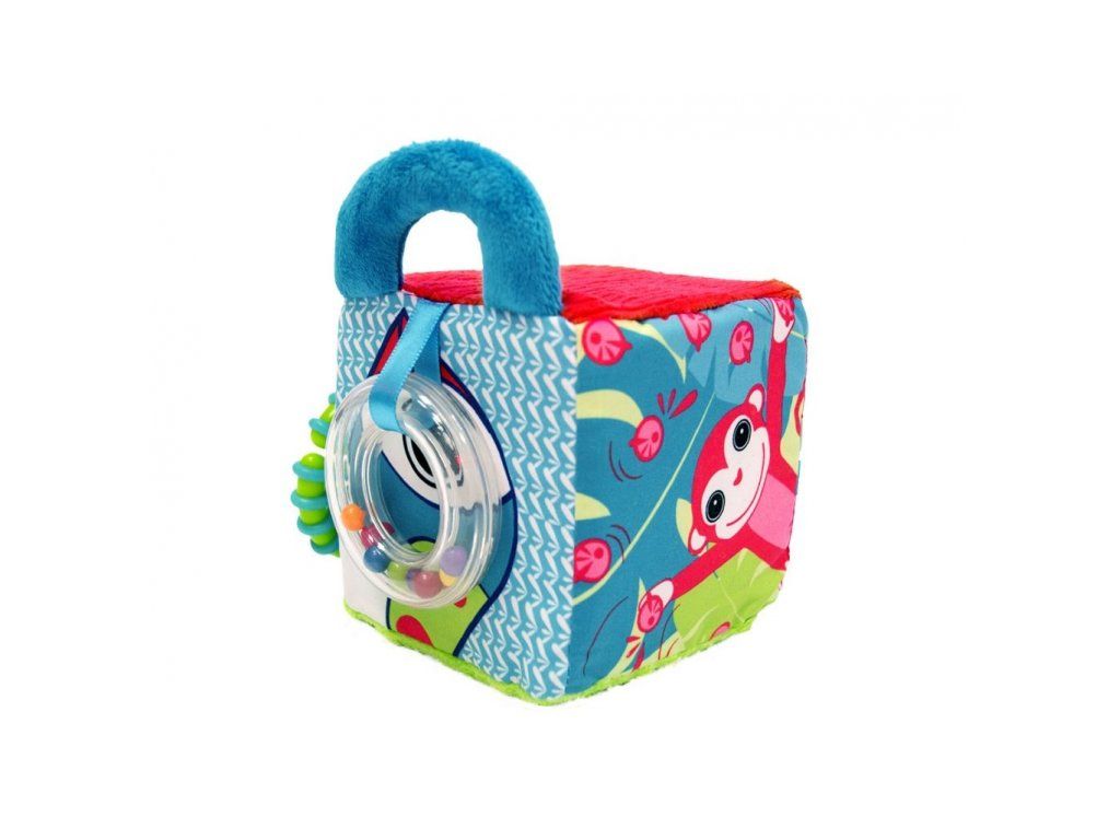 Měkká textilní kostka nabízí různorodé aktivity, které vaše dítě zabaví a zároveň pomáhají rozvíjet jeho jednotlivé smysly i motorické dovednosti dítěte. Pozornost dítěte upoutají výrazné ilustrace motivů z džungle, průhledné chrastítko s korálky, plyšová rukojeť i kousátko. Kousátko v podobě kroužku umožňuje kostku připevnit na kočárek či autosedačku. Rozměry: 10 x 15 x 10 cm Vhodné pro děti od 3 měsíců.Doplňkové parametry