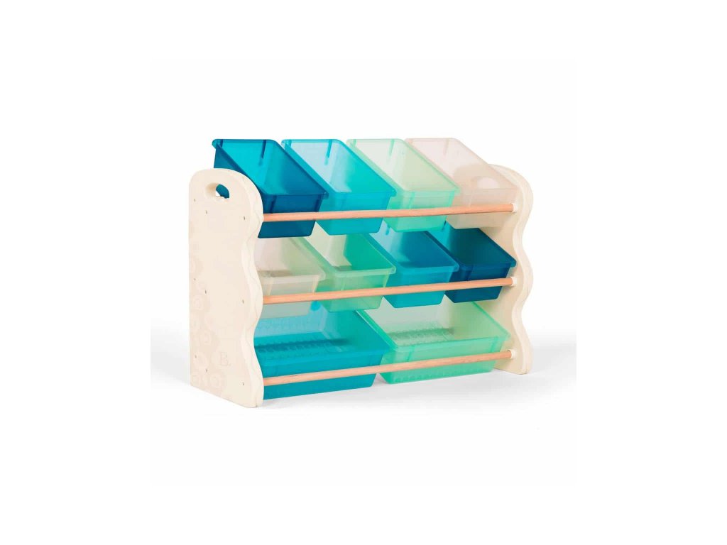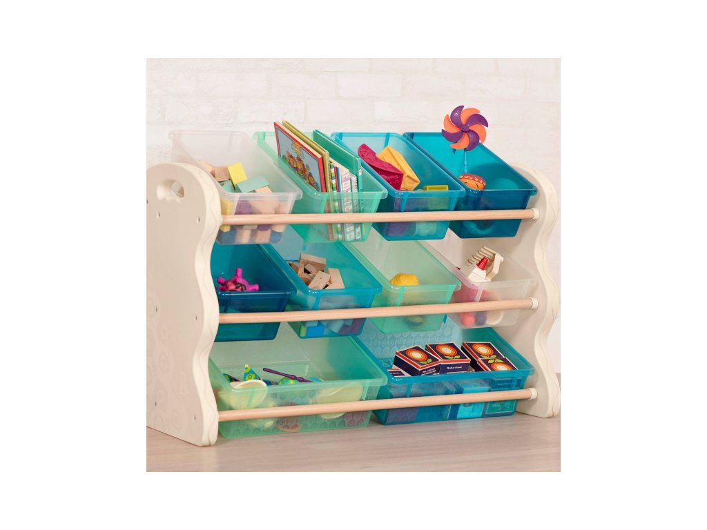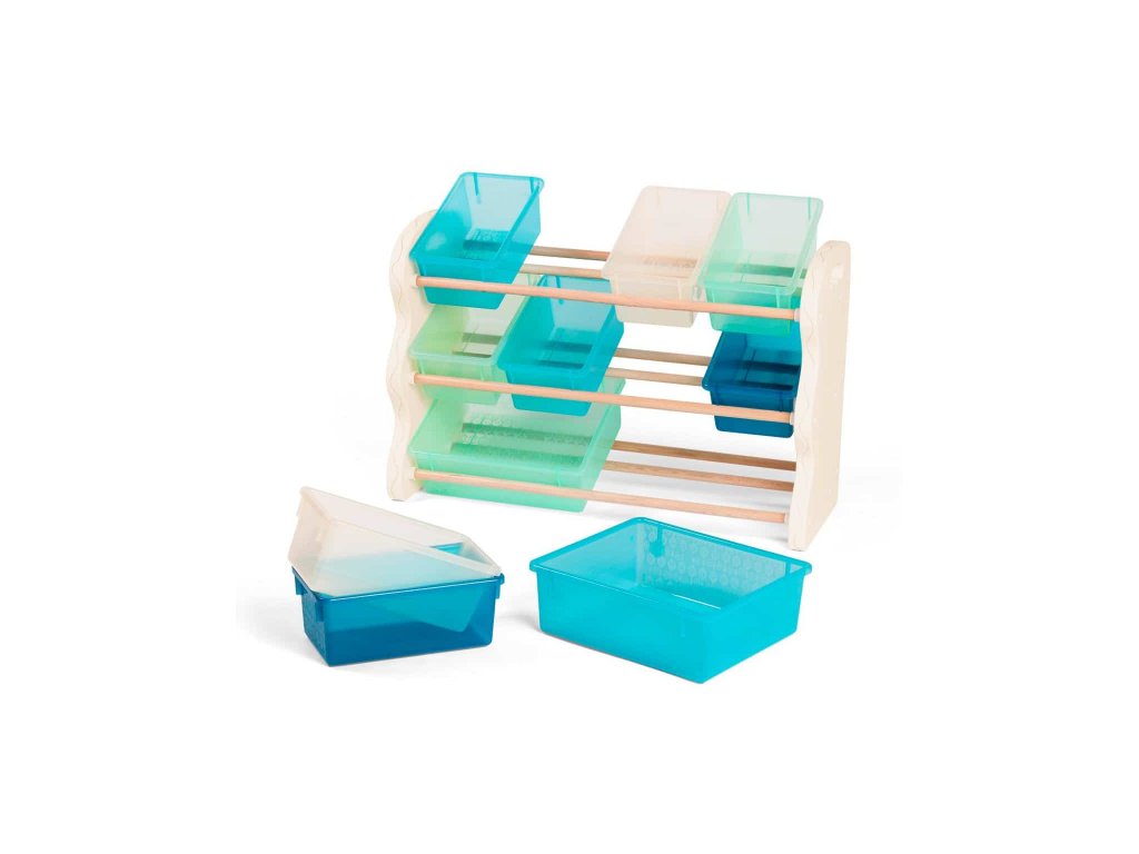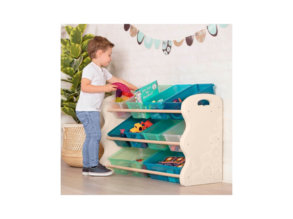 Stylový organizér na deset plastových boxů zjednoduší a zpříjemní vašim dětem každodenní úklid hraček, výtvarných potřeb apod. Boxy ze stojanu snadno vyjmete, takže pro hraní i uklízení si je vždy můžete odnést, kam potřebujete. Dvě velikosti boxů umožňují přehledné ukládání drobnějších i větších předmětů. Otvory na bočních stěnách organizéru usnadňují jeho uchopení a snadné přemístění. Materiál: boční stěny - plast, tyče - dřevo Rozměry: 90 x 67 x 37 cmDoplňkové parametry