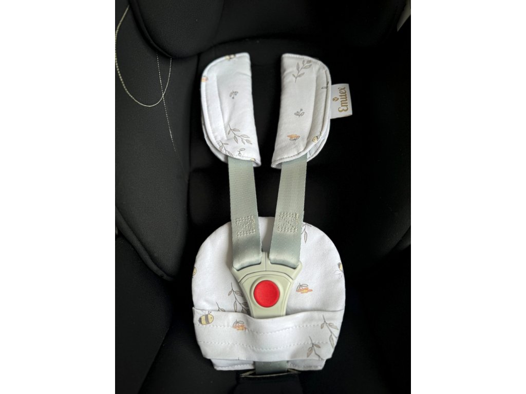 Použití vhodné jak v kočárku, tak v autosedačce. Ramenní polstrování mají suché zipy pro rychlé nasazení, větší polstrování se na sponu autosedačky navléká.