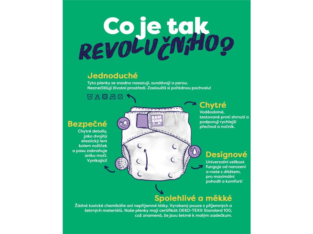 Střih nové generace - Dokonale padne i novorozencům. Jediná plenka opravdu od narození po nočník ! Revoluční opakovaně použitelné plenky - neobsahují škodlivé materiály a jsou vybaveny nastavitelnými druky, prodyšnými absorpčními tkaninami, voděodolnou vrstvou a nepropustnou konstrukcí. Každá plenka je dodávána s jednou výkonnou absorpční vložkou. Tato chytrá superabsorpční vložka je tvořena kombinaci froté tkaniny z bambusových a polyesterových vláken a z polyesterových mikrovláken uvnitř. Mimořádně variabilní, možnost dokoupení 3 různých typů absorpčních vložek výrazně zvyšuje přizpůsobivost potřebám dítěte Nové, užší separační vložky pasují lépe do všech typů opakovaně použitelných plen. Udržují pokožku dítěte v suchu a pohodlí. Další použití je jako vlhčený ubrousek. V praktickém kapesním balení o obsahu 100 listů v roli. 100% biodegradabilní, kompostovatelné a spláchnutelné* navrženy tak, aby odpuzovaly tekutinu, čímž udržují děťátko v suchu a pohodlí** chrání plenku proti znečištění dětskou stolicí*** mohou být použity jako přírodní dětské ubrousky při výměně plenek a pro další účely**** vyrobeny ze 100% viskózy * V případě znečištění stolicí ji jednoduše spláchnete (jednu po druhé) do toalety. Pokud je jen mokrá od moči, může se kompostovat. **Plenková separační vložka propouští tekutiny do vícevrstvé plenky a snižuje jejich zpětné působení na pokožku dítěte. Tím brání působení moči přímo na pokožku a snižuje nebezpečí vzniku plenkové dermatitidy. *** Je-li znečištěna dětskou stolicí, chrání před tímto znečištěním plenku. Nepoužívejte separační vložku, když má dítě řídkou stolici (většinou při kojení). Stolice pak po vložce sklouzne a nezachytí se v plence a znečistí plenkové kalhotky i další oblečení. ****Jednoduše namočit do teplé vody, případně přidat několik kapek esenciálního oleje napomáhajícímu čištění a zklidnění pokožky.Doplňkové parametry